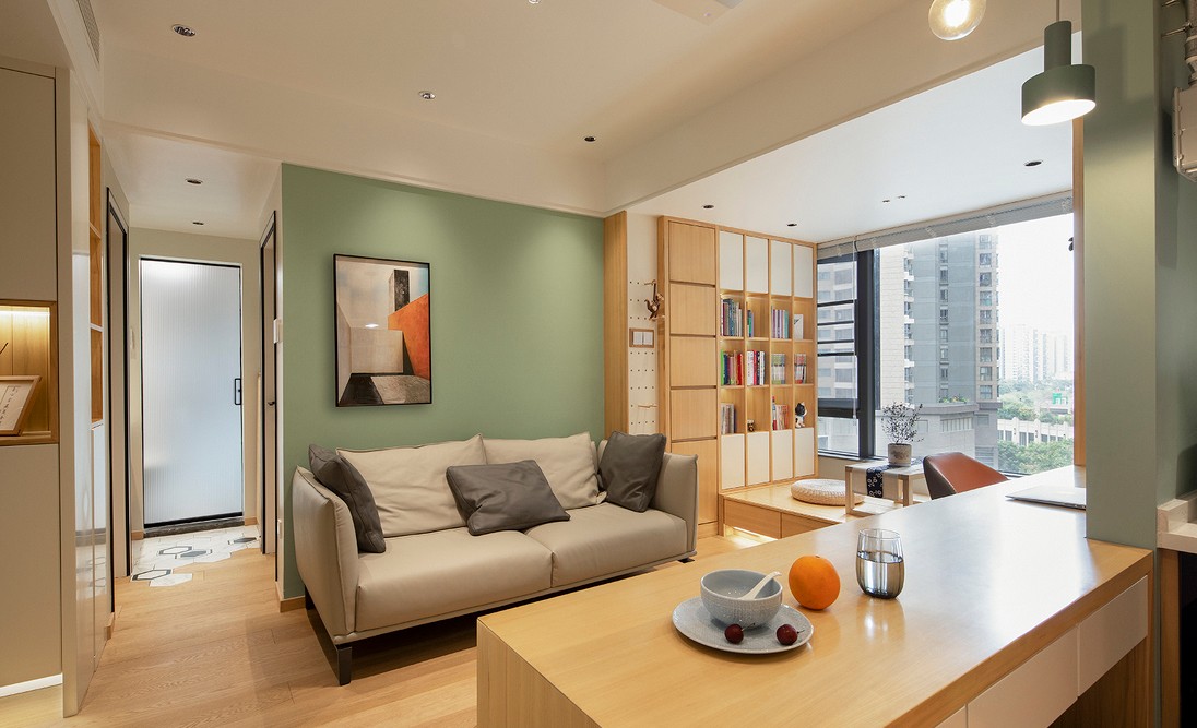 灰豆绿色的沙发背景墙在整个空间起着画龙点睛的作用,挂画靠在一边让墙体比例更加协调、舒适;木色的地板使空间更加温馨。