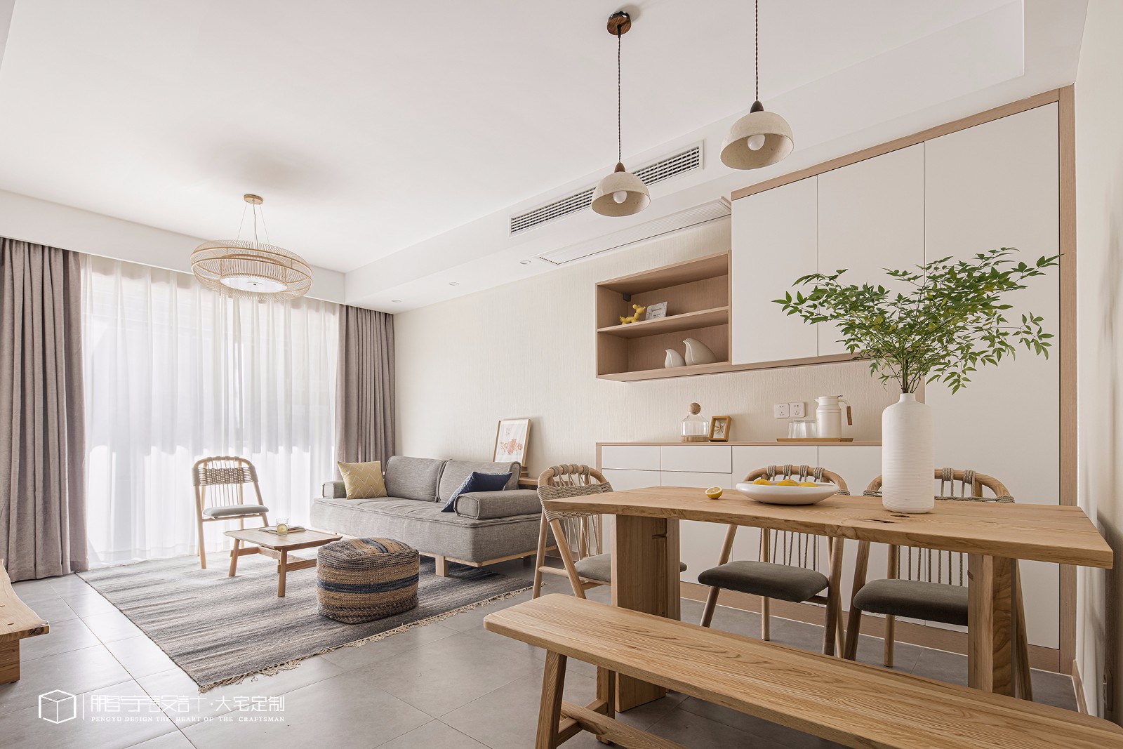 纯净的白与柔和的木,调和了整块空间画布。原木餐桌搭配同款编制椅,禅意十足,整个空间弥漫着和谐自在的小情调。