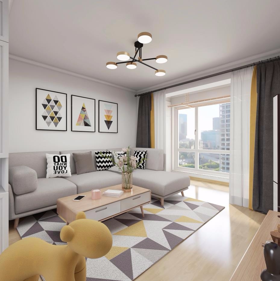 简约北欧风,电视墙和顶面石膏线造型,搭配原木色家具。
