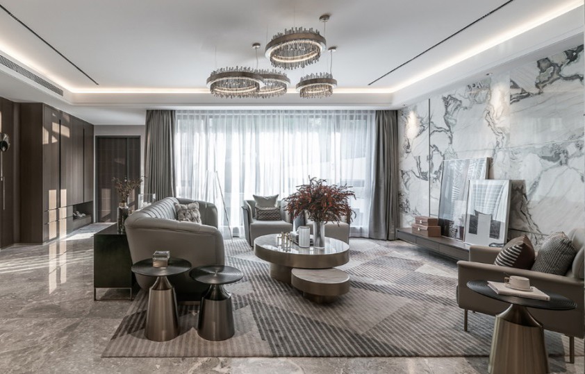 空间运用简洁的材料的肌理,以当代的手法在大理石墙体之间营造美学交集,将温和的金属感融入不同的居住空间,渲染出不同的生活场景。