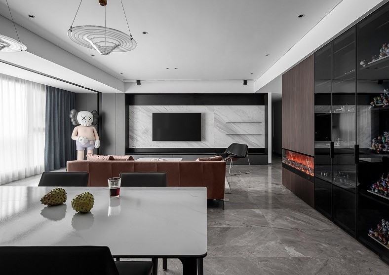4690mm长度的电视墙拉伸了整个空间的横向感,大理石材质与黑色护墙板进行叠层搭配,用基础的线面组合释放无限的空间思维,在视野上延伸宽度与深邃感,底部的收纳柜放置屋主未开封的手办使用。
