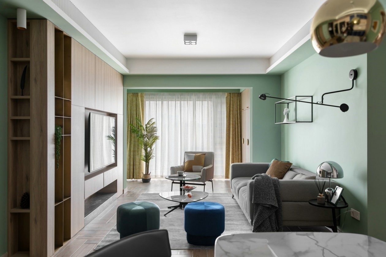 本案业主为三口之家,是业主的改善住房,男女业主喜欢的风格差异较大,女业主喜欢色彩靓丽并且充满活力生机的家居空间,而男业主则喜欢极简黑白灰冷峻的都市风,这两种风格很难融合,最终我们商讨出软装色系方面还是以女业主喜好为主,而硬装呈现则结合现代简约风的设计手法,最终才有了这套绿意盎然的现代休闲风作品……整体定位现代休闲,整屋***块手法处理,原木色饰面板+3种绿色+藏蓝色局部跳色。