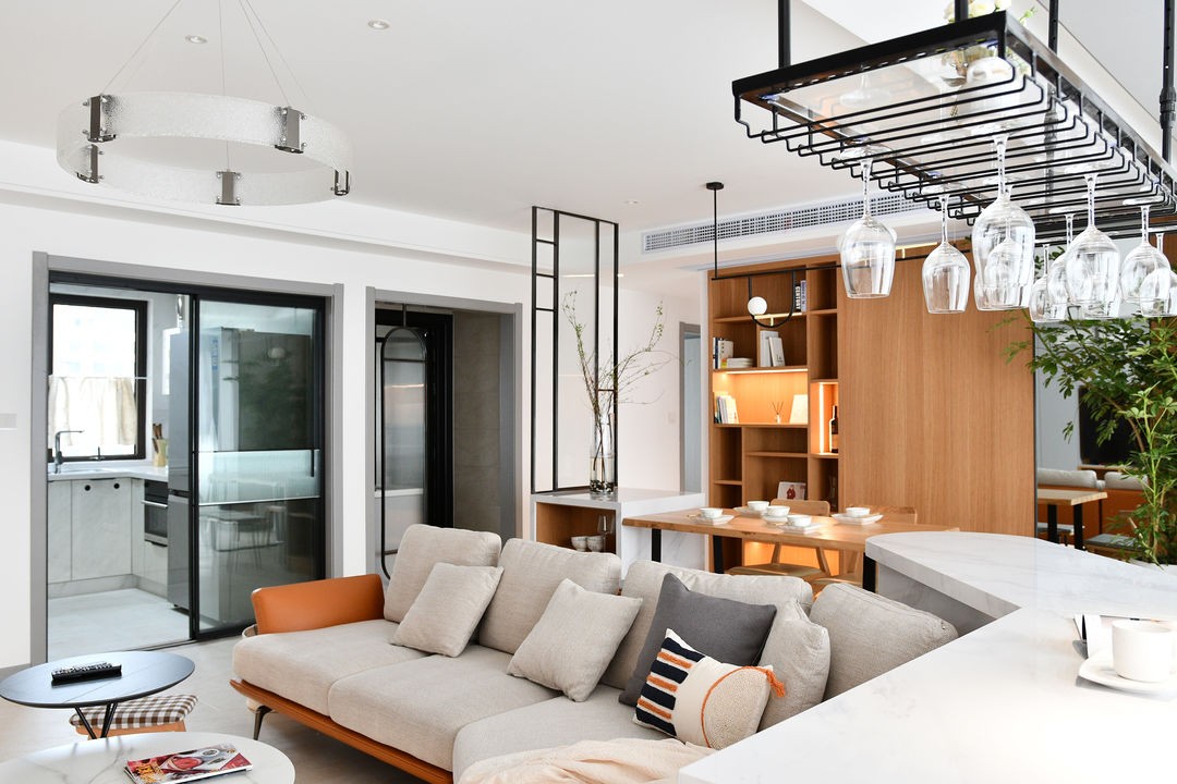 阳光极好,使客餐厅看起来更宽敞, 超宽的大阳台电视背景整个墙面做了收纳,以便日常实际生活。沙发的款式和定制的异形吧台也是客厅的一个亮点。