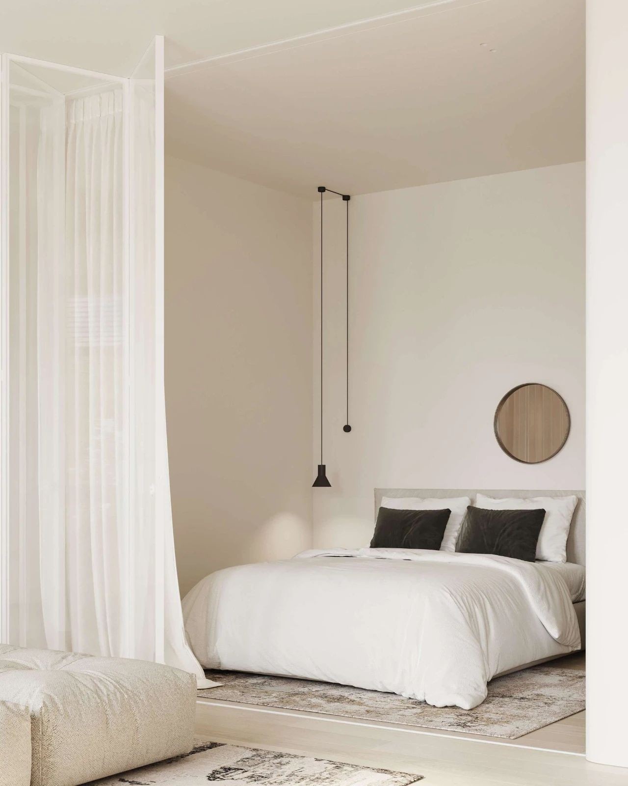 主卧与客厅打破墙体进行分割,反而使用纱帘去进行分割,及保证了空间的私密性,也使空间看起来不压抑