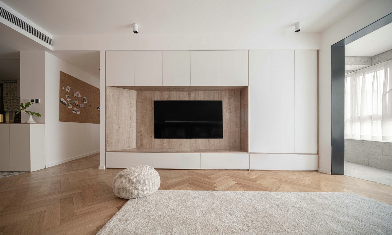 主卧的套房设计,可以给业主更强的居住独立性以及舒适感。整体延续了客厅的风格,白色和木色互相呼应,绿色作为空间的点缀色。照明以射灯和灯带为主,加上床头的落地灯做局部照明,整个空间显得很有层次。