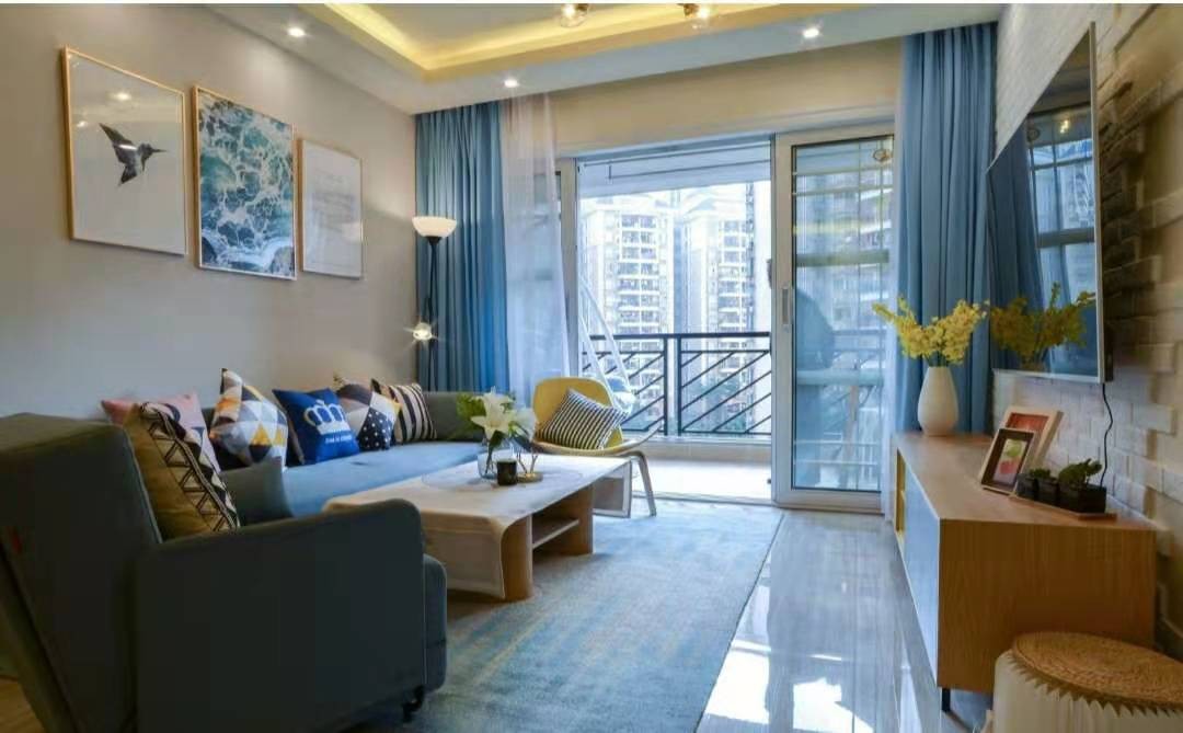 以浅蓝色为主点缀决定客厅的主色调,重点突出2到3种颜色,使整个空间多彩而不会觉得凌乱,暖色调和精致的材质可以给人柔和之感