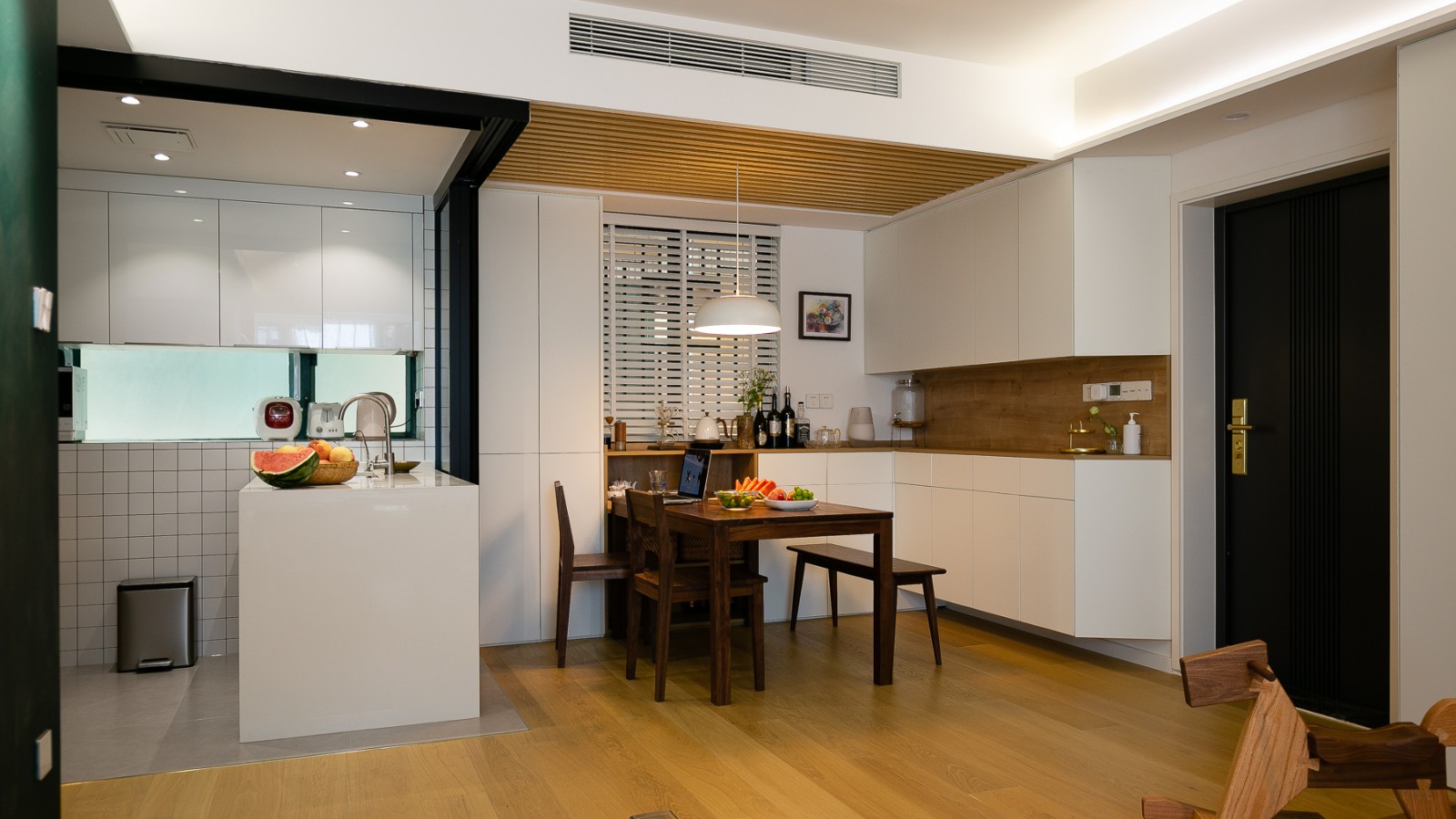 打通封闭的厨房空间,用多扇对角推拉门做成可分可合式,这样一来,不但增强了餐厨客三个空间的交互性,也使得整个布局也变得更加活泼丰富。
