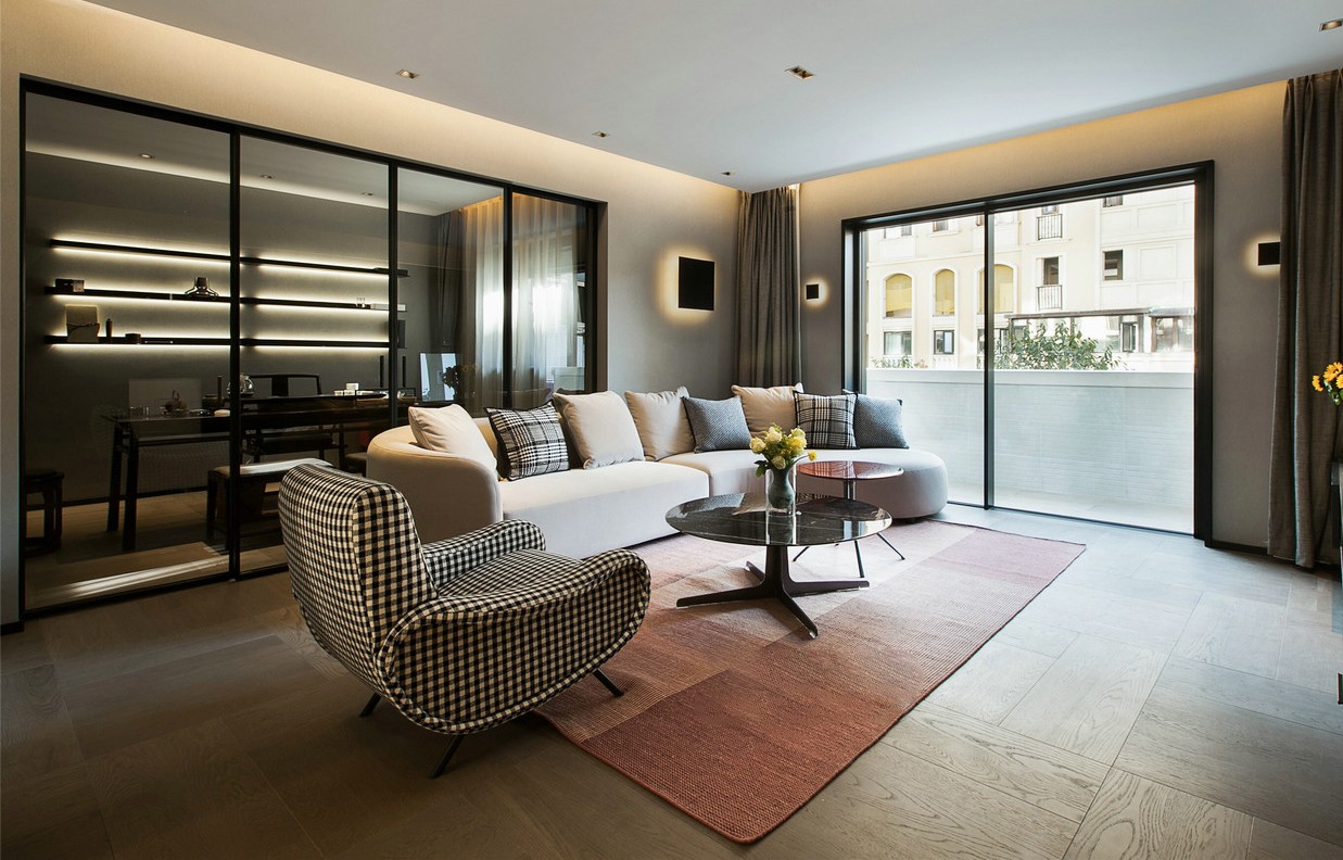 黑胡桃木色墙面配米色沙发,高冷极简中显现柔和优雅,方格纹是永不过时的经典元素,增添一些复古情愫。