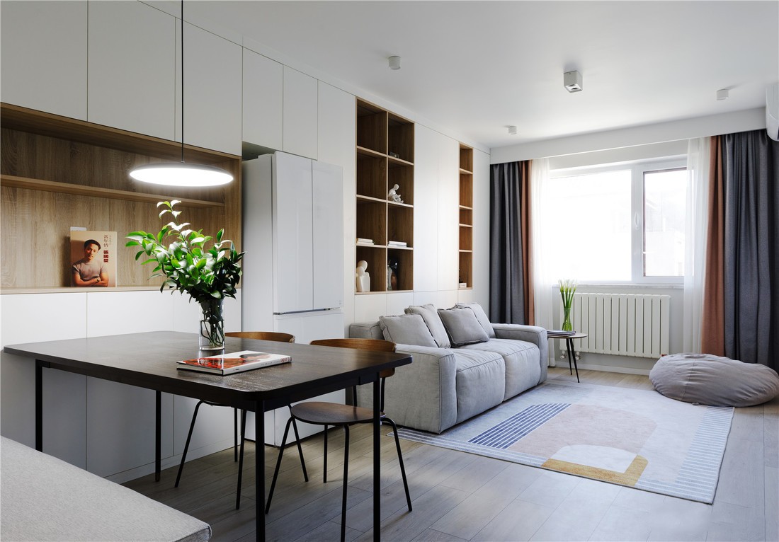 沙发背景墙,设计成整柜,柜体从窗边一直延伸至餐厅,增强了两处空间的联动。