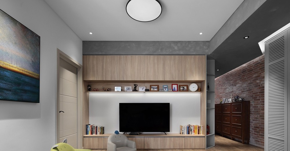 女主人喜欢这个木色的电视柜,简约、时尚。隔板上整齐地摆放着她最爱的家人照片,以及宝贝们的玩具模型、乐高。留白的墙面给电视机做背景,实现它的真正价值。顶天立地的白色百叶门大柜子拥有强大的收纳空间,让家能够一直保持着干净整洁的模样。