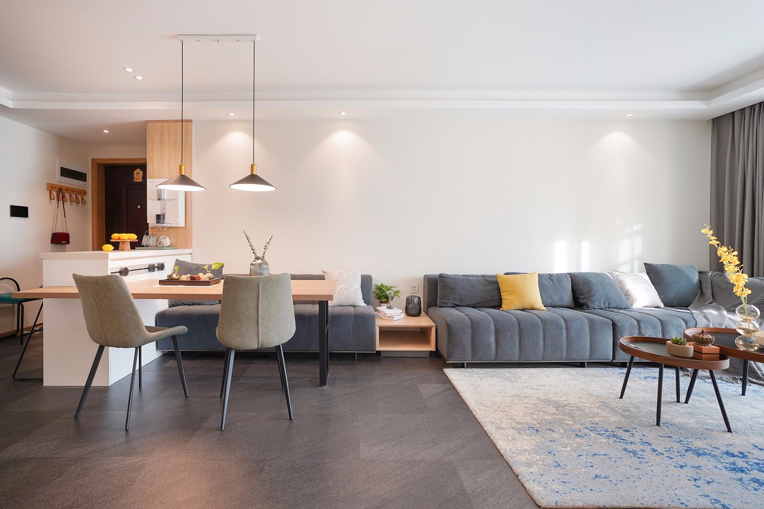 餐厅区域解决了吧台小酌、正餐、给水、小家电等功能需求,因为餐桌和吧台组合在一起的,搭配定制的卡座沙发,充满着围合感,无论是日常用餐,还是朋友聚会,沟通无间。