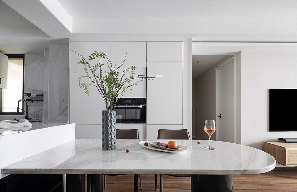 阳光透过大大的落地窗洒进客厅,慵懒柔和的气息萦绕于质感现代的家居之中。