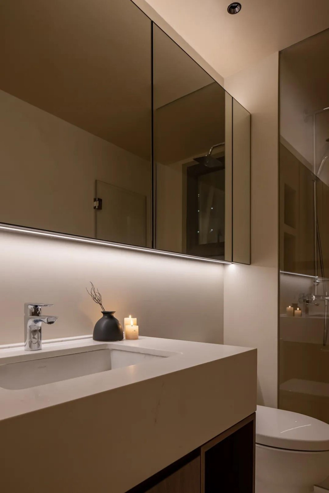 洗手间延续了厨房的设计风格,艺术涂料、镜柜与金属构成了现代科技所能给我们的最便捷的生活体验。
