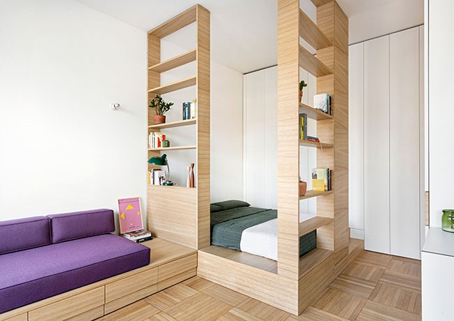 量身定制的地台,成功划分出的卧室区域,利用开放式书架形成隔断,既有空间收纳,又能保证视线和采光,打造出多功能高颜值卧室。