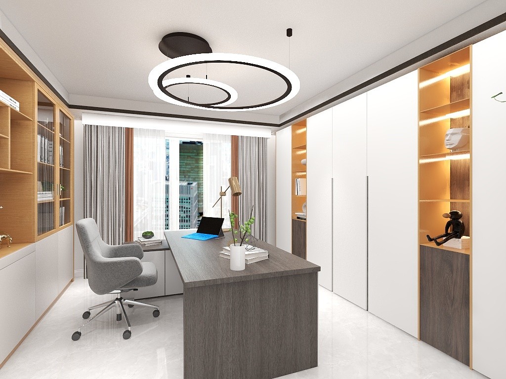 客厅打破常规布局,做成书房模式,两边都做成书柜,增加储物。
