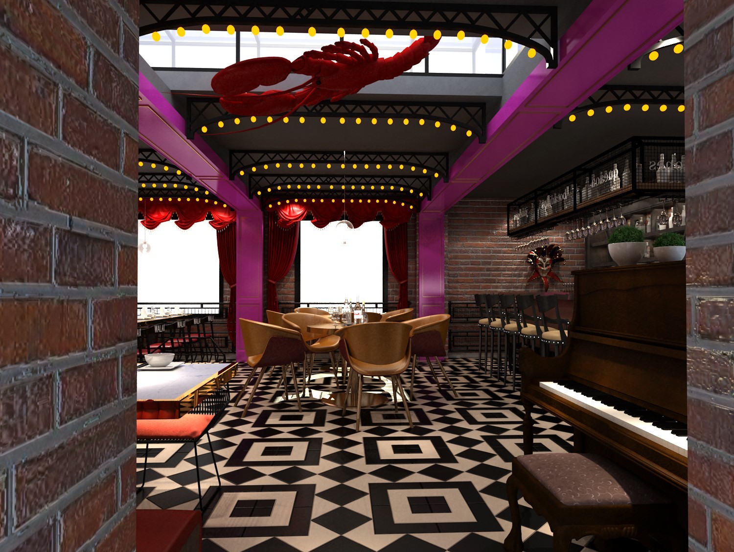 本方案风格以复古工业风为主,采用黑白色系,红砖等装饰手法,黑色给人的感觉是神秘冷酷的,白色给人的感觉是优雅静谧的,白色和黑色混合搭配的话在层次上会出现更多的变化,散座区的餐桌合理布局以致合理疏通人流量。利用声、形、色等技巧,充分展现整体设计意图,***限度吸引客人入店。