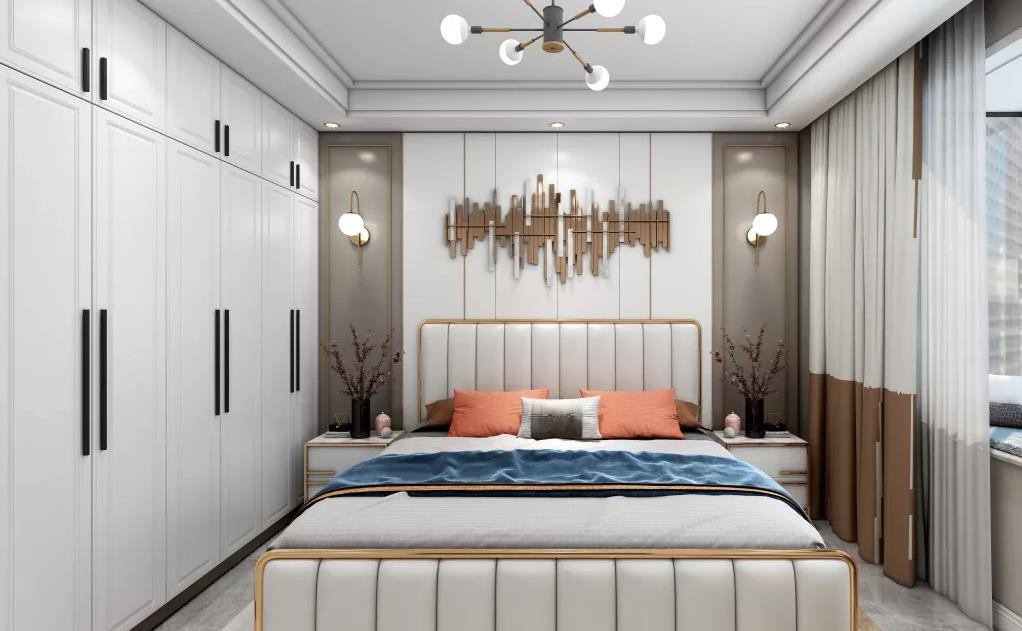 卧室采用米白色元素让整体都显得温馨,和谐,吊灯也很有艺术感,没有过多的装饰。