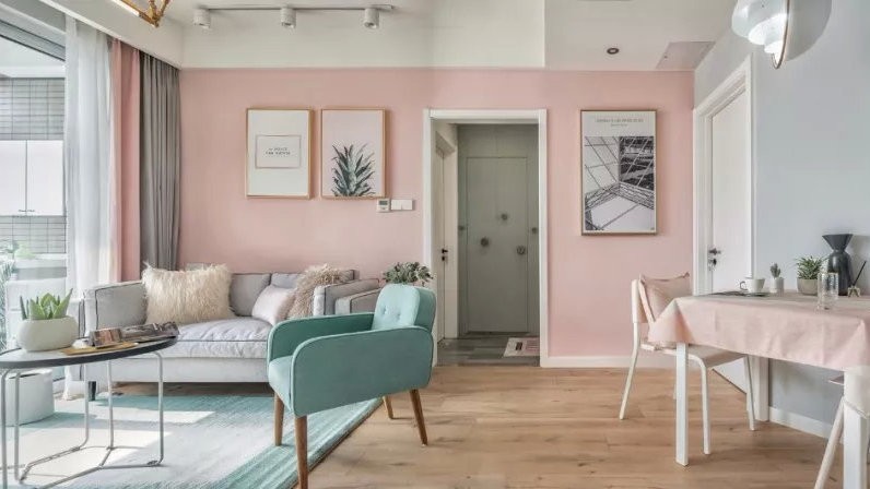 客厅整体简约舒适的空间,以浅灰色电视墙+粉色沙发墙,搭配自然舒适的木地板,呈现出一种轻松自然的浪漫情趣氛围。