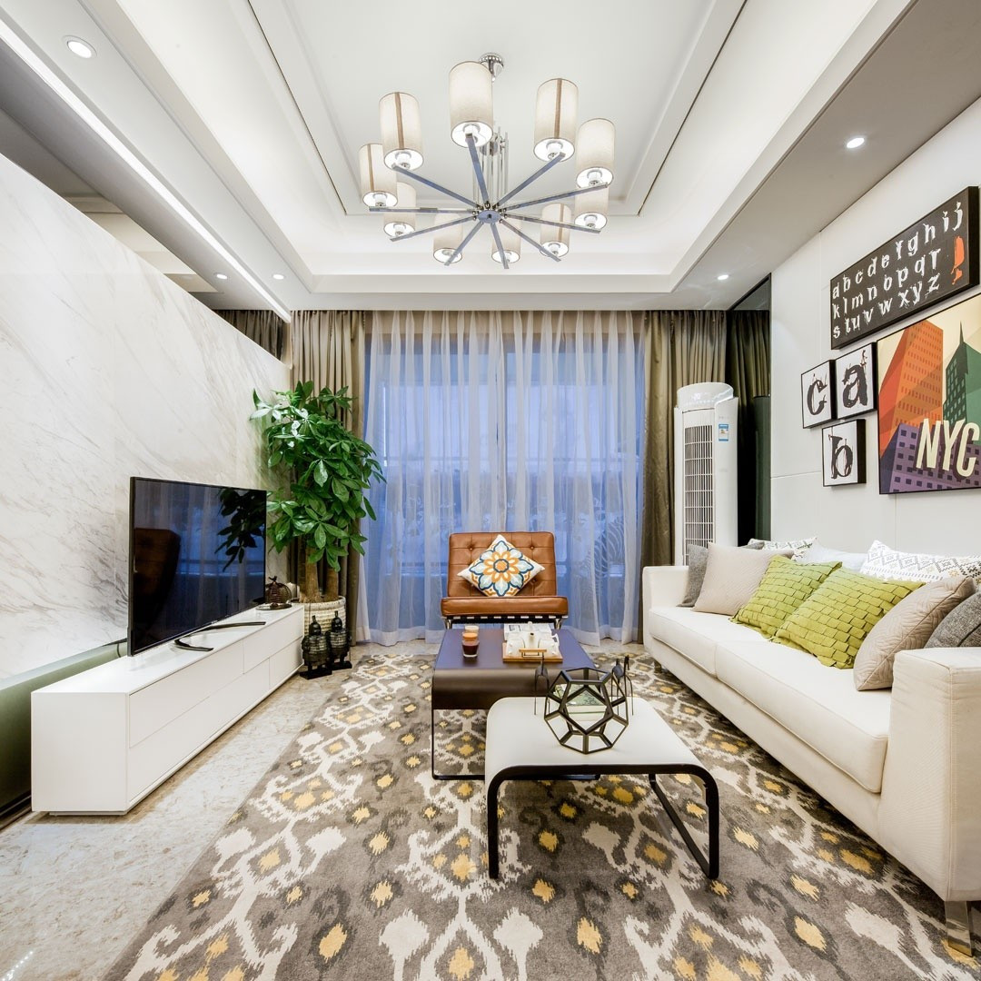 客厅空间采用大面积的定制柜体,将入户鞋柜及电视柜还有储物柜做到统一,即满足了功能上的需求,也满足了业主需要大量储物的要求。将一部分阳台封闭,使得并不大的客厅空间得到衍伸,采用大面积的落地玻璃,即增加了采光,也将窗景尽收眼底!
