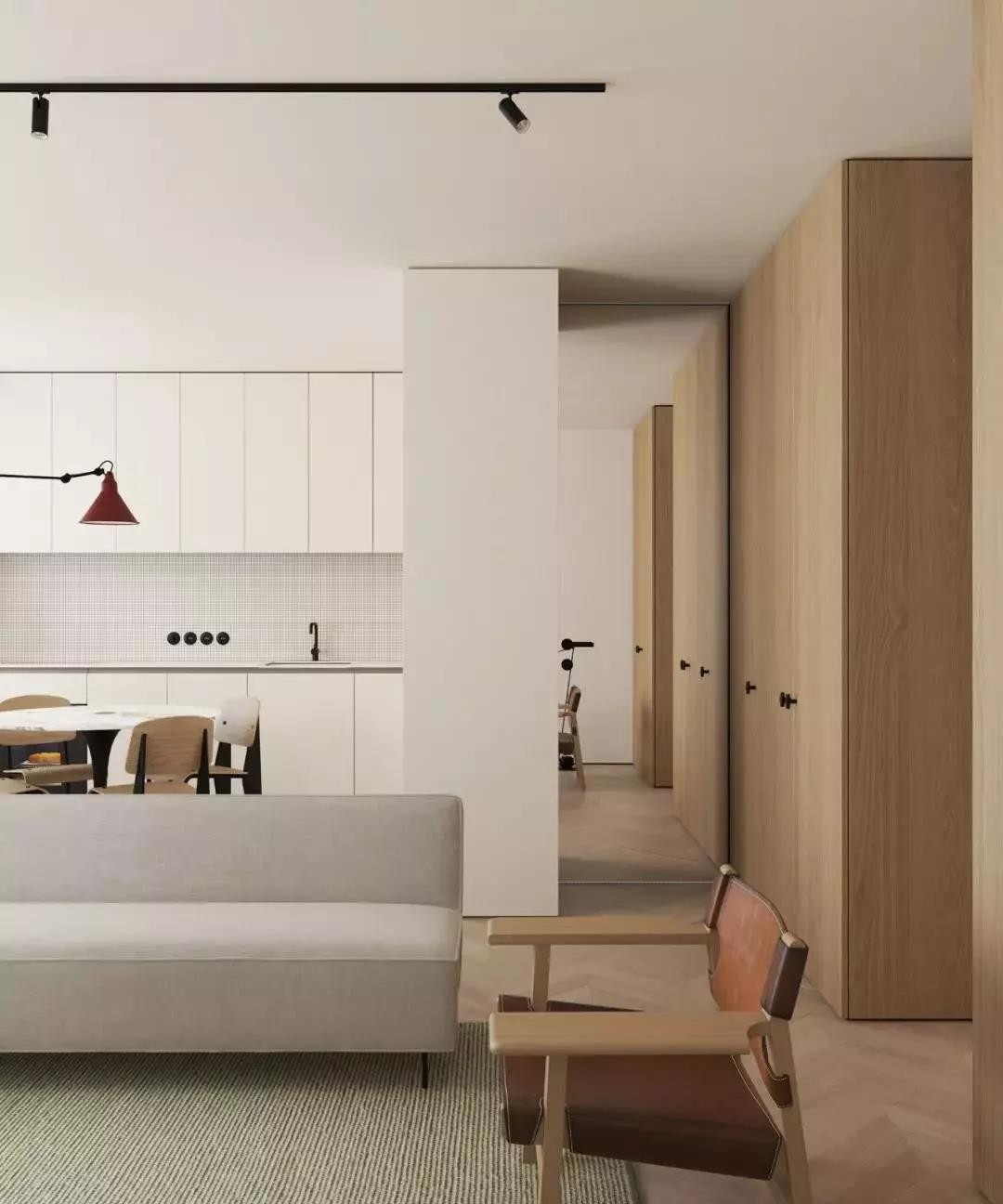 餐厅与厨房以一体式的空间布局,橱柜与收纳柜包围了餐厅,为简洁的小空间提供了充足的收纳储物位置。