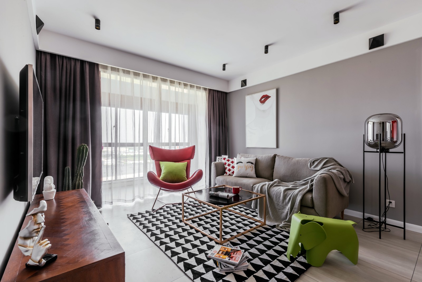 灰色与红色的窗帘搭配,拉上窗帘也是一幅画。