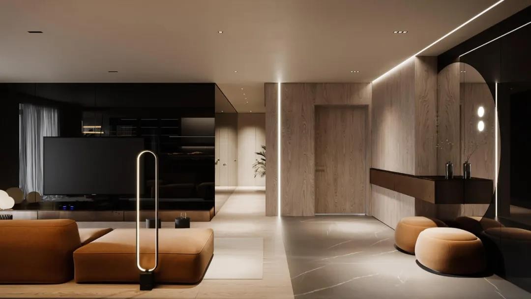 计师结合现代化的居家元素,呈现了一个温馨、质雅的室内空间。空间中没有过多的强力照明,更多的是辅助灯源,来营造简约、温馨的居家气氛,嵌入木饰面中的线性光作为辅助照明,增加了空间的亮度。
