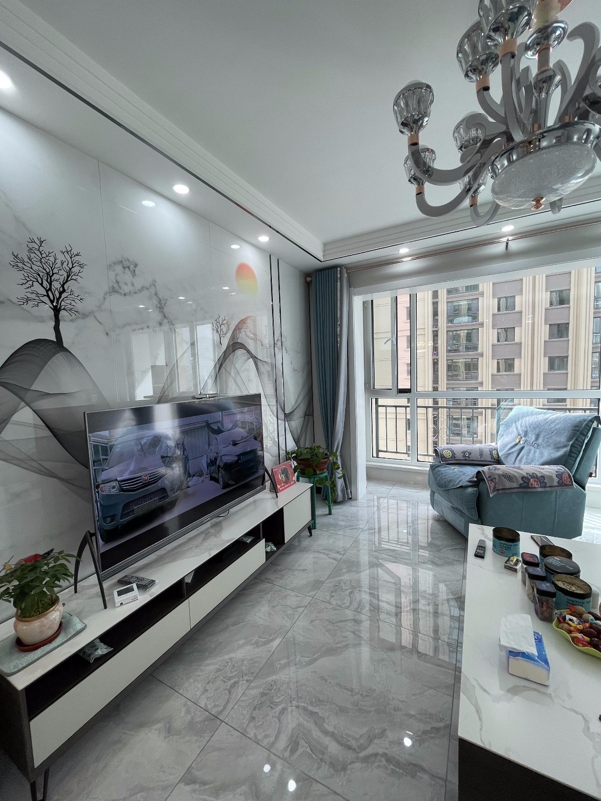电视背景墙是定制的成品造型瓷砖电视墙,大气上档次,也是时下比较流行的款式