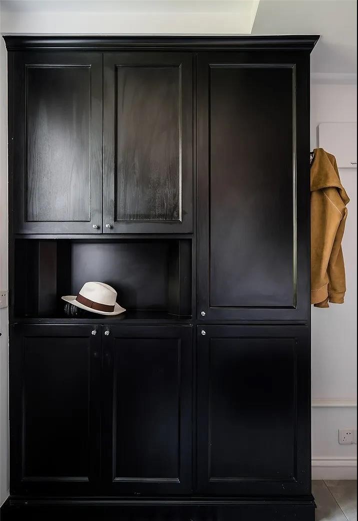 玄关,推门进来正对黑色玄关柜,到顶的设计收纳空间十分充足,柜子侧面有挂钩挂包包外套,很实用便捷。