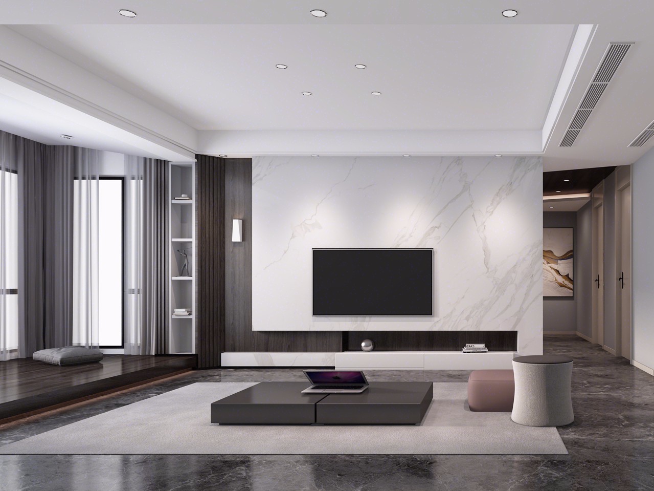 简约风***的电视背景墙岩板加木饰面做抬高地台