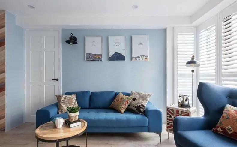 客厅用不同深浅造型的皇家蓝色系作为基调,搭配干净利落的白色墙面,形塑清新中不失优雅的英式乡村风。