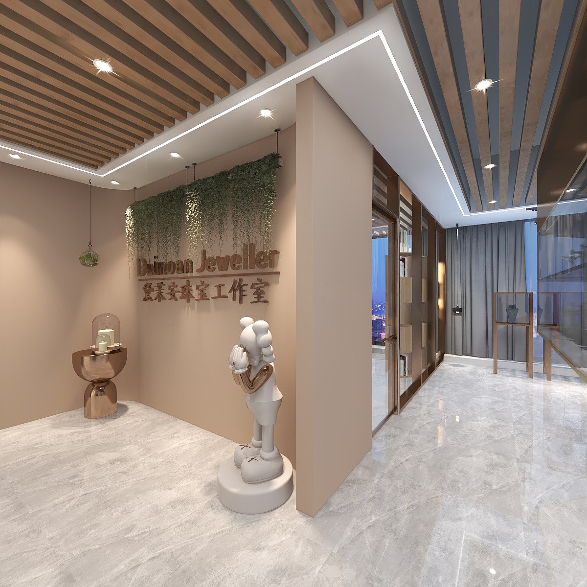 弧形背景墙配上绿色植物及金属玩偶摆件,让空间更显档次。