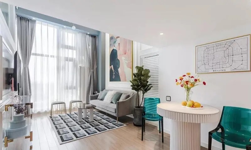 整体色彩选择了蓝色与白色的组合搭配,流畅的线条勾勒自然清爽的感觉,加上地毯与背景画的装饰,增加了设计的层次感。