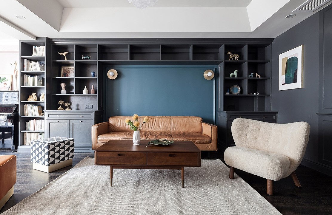 沙发背景墙的收纳柜满足了日常书籍等时尚手办、潮件的摆放。铜制的圆形壁灯造型简约又不失时尚。
