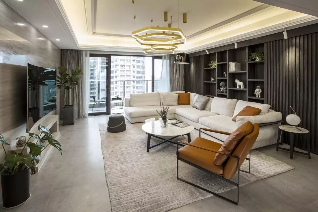 简洁吊顶装上六边形的组合吊灯,浅棕色瓷砖电视墙,深木色的书架沙发墙,结合做旧的灰调哑光地砖,铺垫了沉稳大方的氛围。