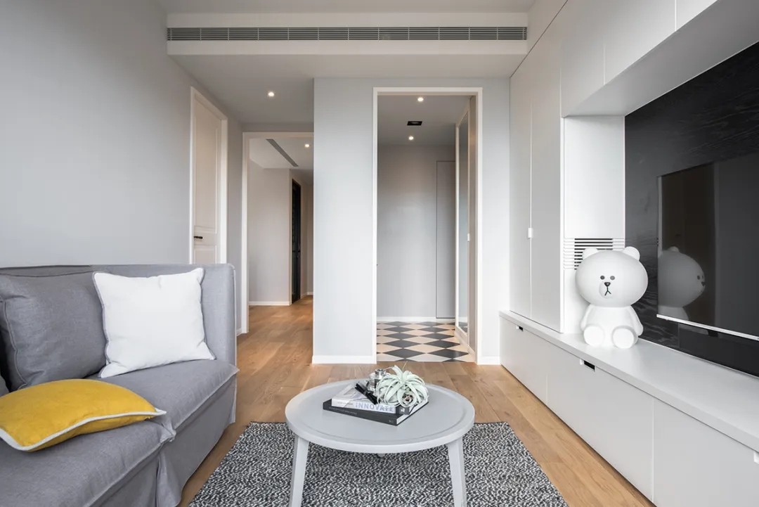 收纳柜的对面是一面镜子墙,满足屋主出门前照镜子的习惯,视觉上拓宽了走廊面积,也合理利用了玄关旁边的空白墙。