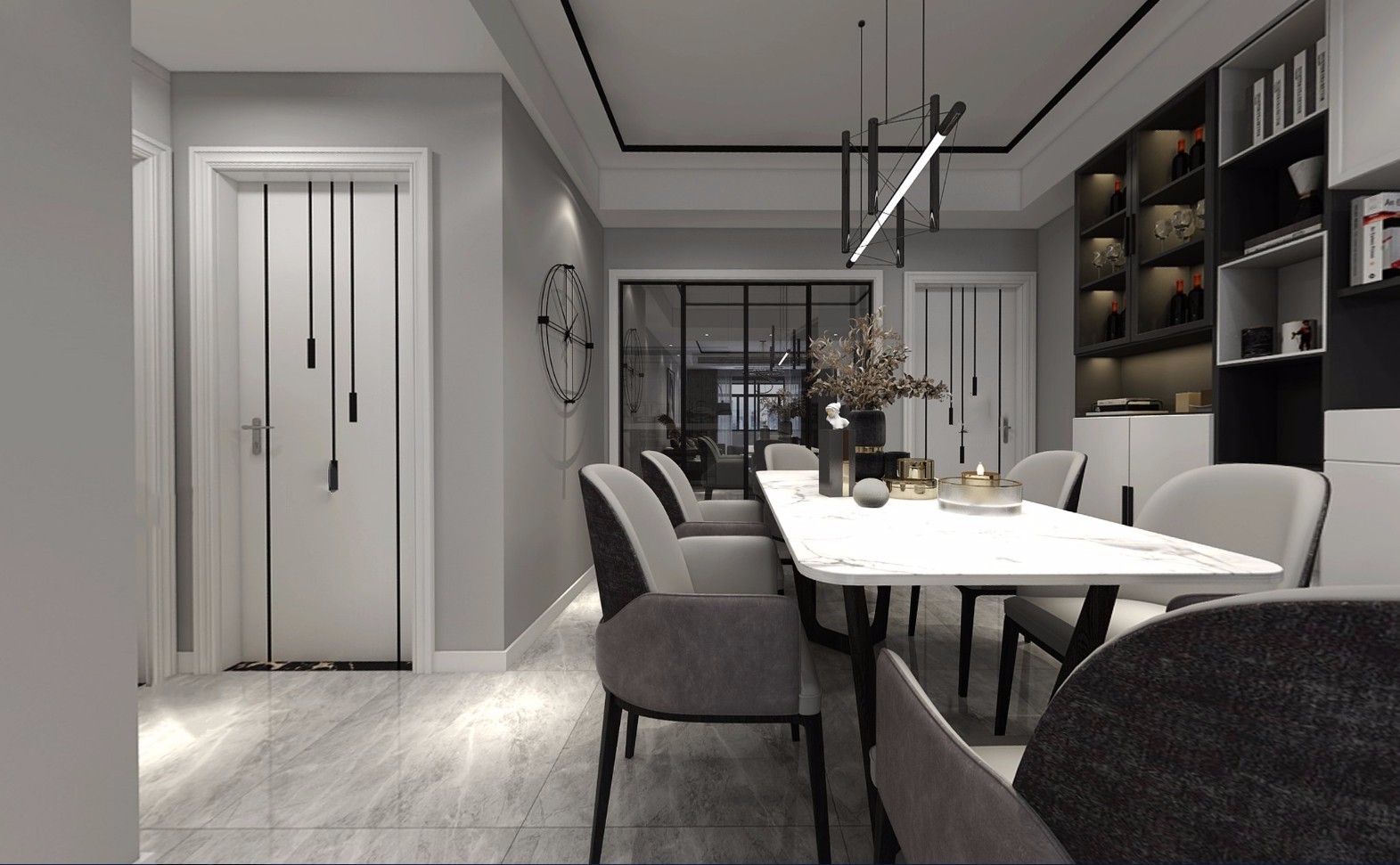 视线随着客厅延伸到餐厅,墙面上的装饰画与客厅的颜色交相辉映,虚实相生