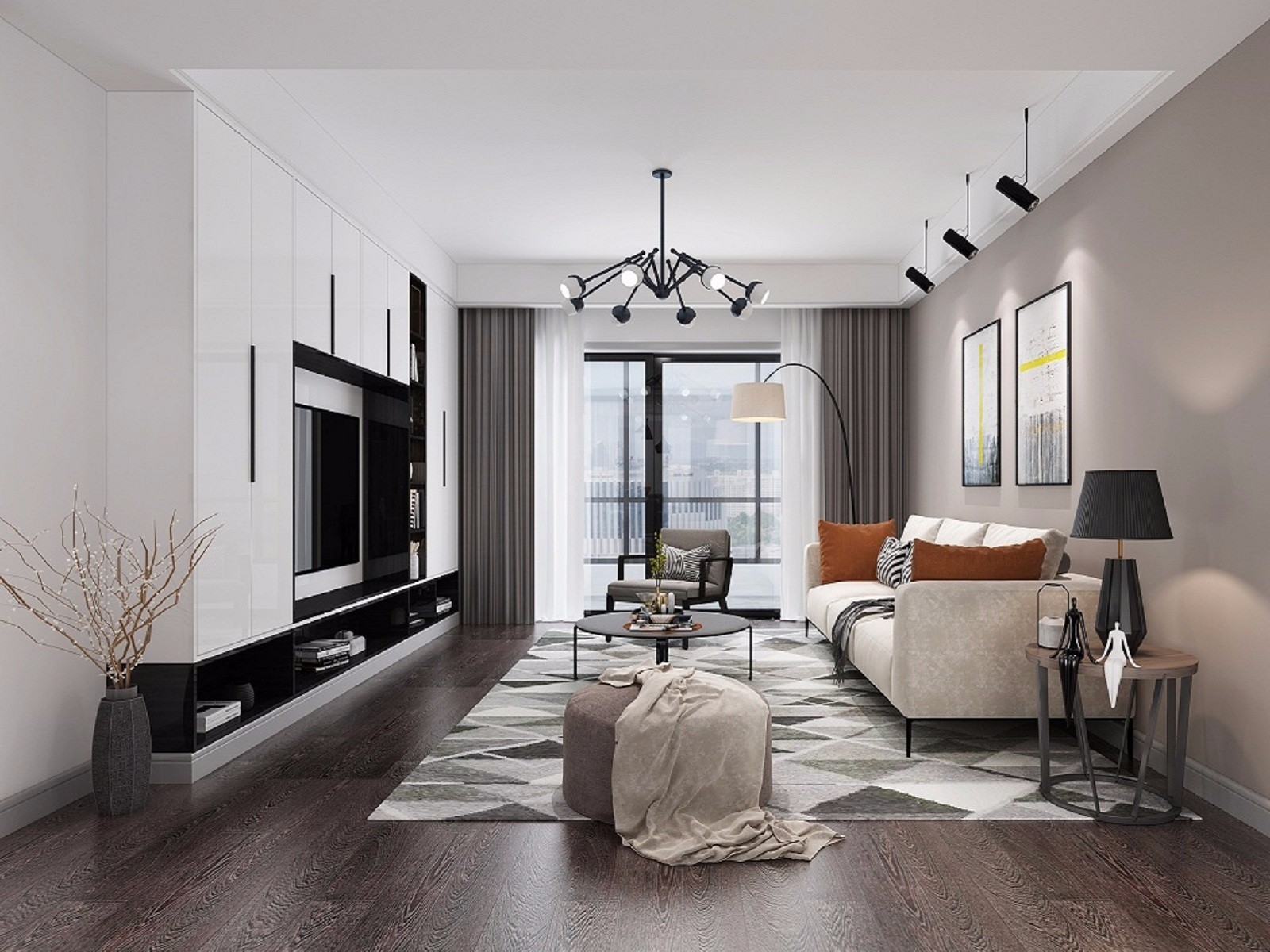 该户型客厅地板采用米白抛釉砖和木地板结合,既大气又容易清洗