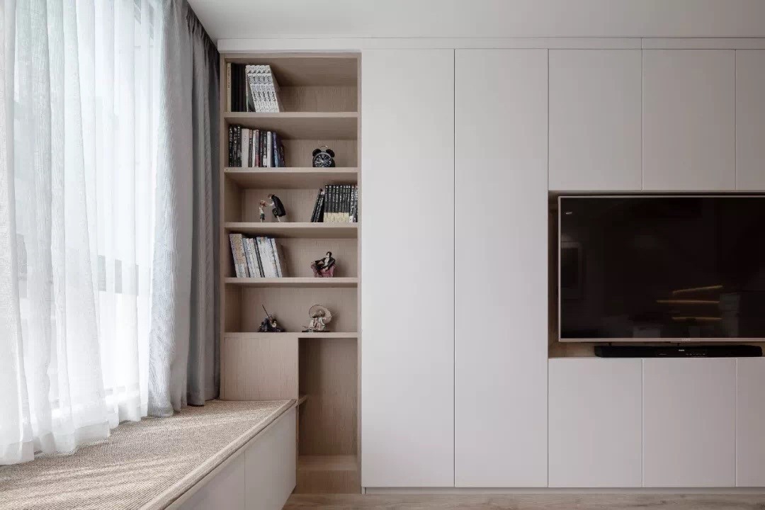 侧边窗台位置做开放式柜体,书本工艺品方便拿取