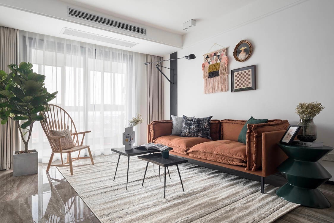整个客厅以白色调为主,搭配亮色家具,是整个客厅看起来非常明亮