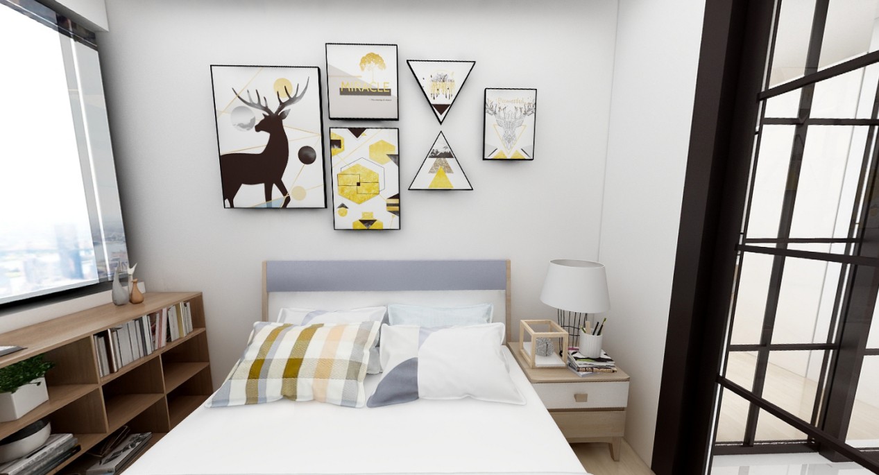 考虑常规1.8米双人床,增加书桌,以便后期办公使用,床对面做一组衣柜,提供日常更换衣物的收纳,