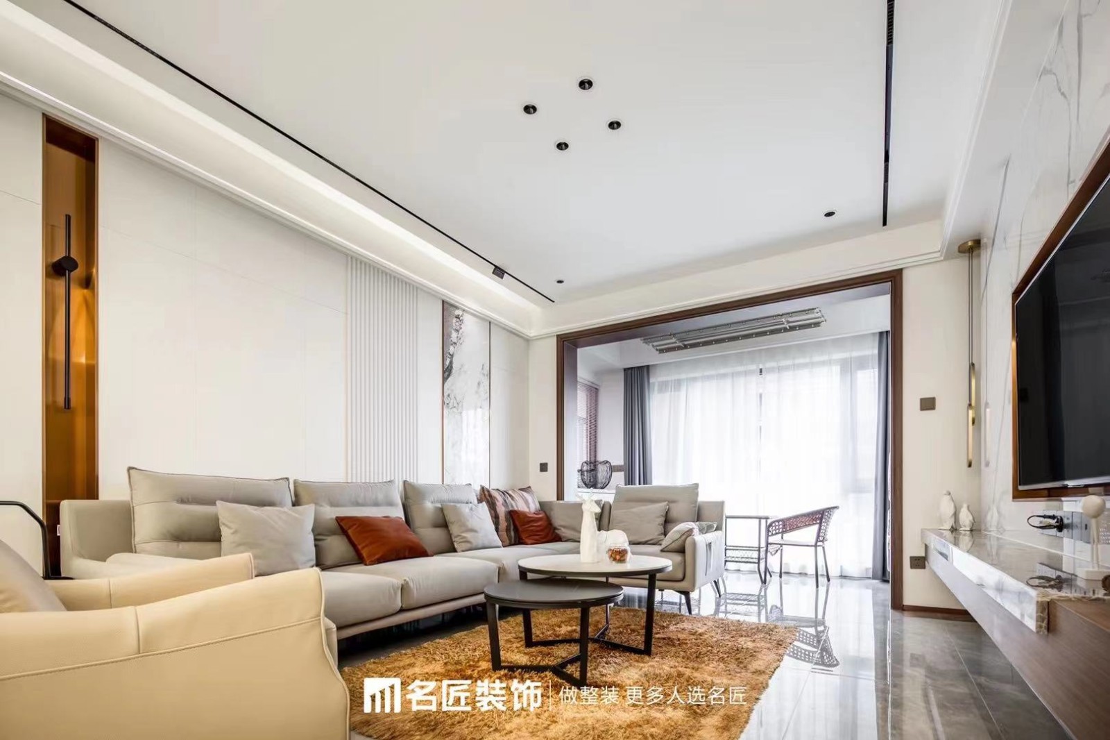 电视墙以大理石为背景,装上一块大理石的搁板电视柜,结合灰色的地面砖,布置出一种现代优雅的时尚大方感。