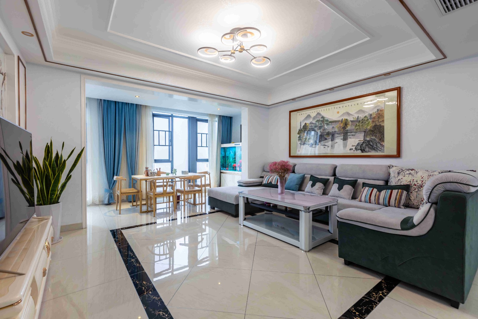 为了空间色彩的和谐,选择了灰白墨绿三色作为客厅的主色调,灰色舒缓心情的同时,再由绿色注入一抹清新,格调满满又质感十足。