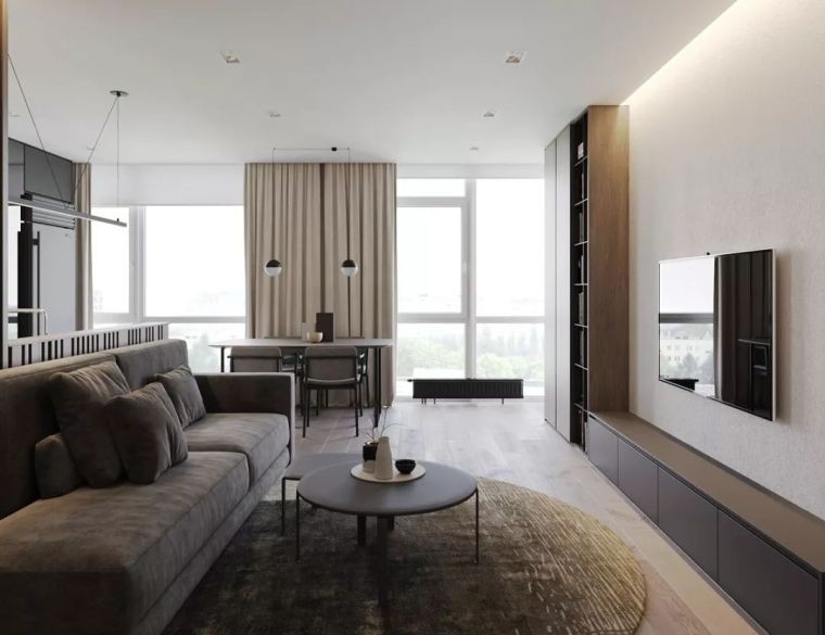 电视背景墙全部留白,底部的电视柜和侧面的书架,在灯光的渲染下营造出温馨氛围。