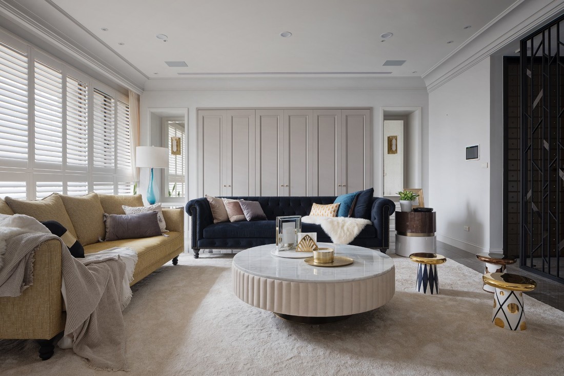 由于客厅格局较大,在沙发后面设置收纳柜,拿捏好尺度,避免空间过于宽阔,并以灰阶为中性基底,并利用壁炉、大面木百叶及门片上隐性的美式线条围塑出温馨氛围。