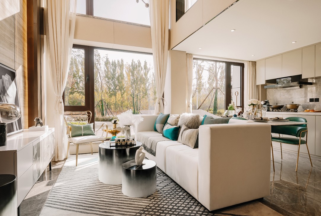 软装家具以皮质,丝绵软包、金属、大理石等元素搭配。