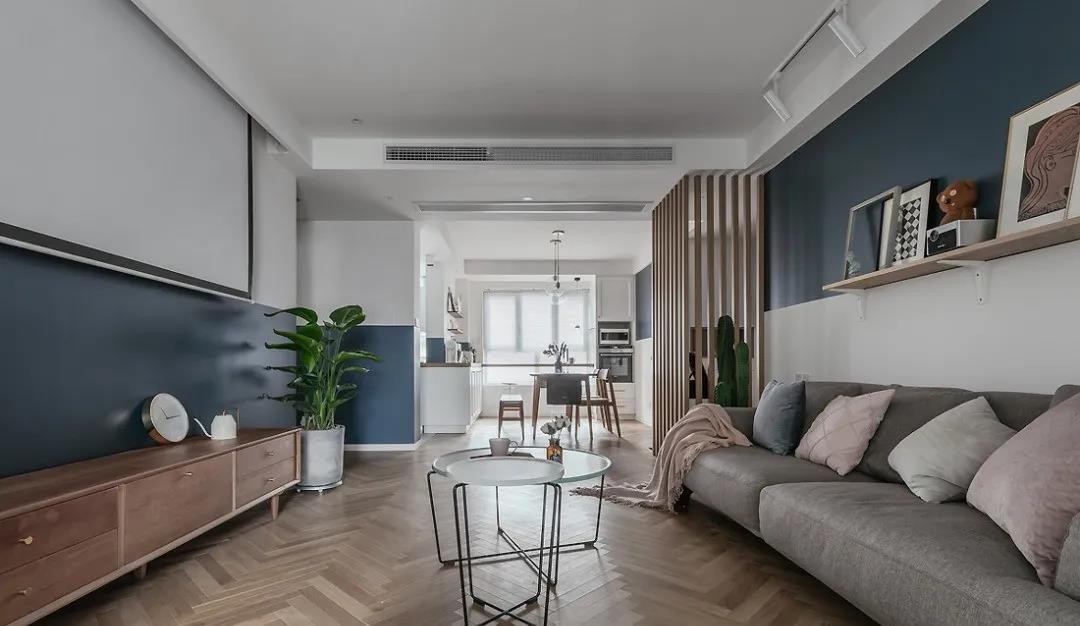 客厅墙壁颜色选用柔和蓝 低明度的蓝色利于眼睛舒适感受 电视墙设计了一组壁灯 更多的作为装饰使用