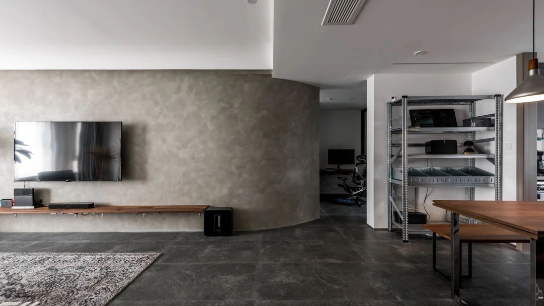 采用了极简和无踢脚线设计,让整个空间浑然一体。电视柜采用整块美国黑胡桃木,保留了天然的纹路和疤痕,极简自然纯粹