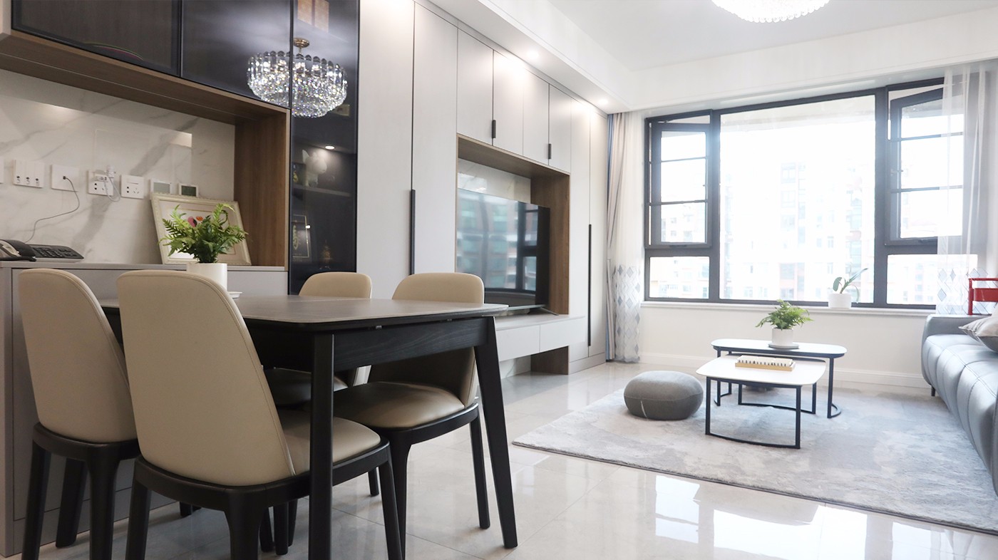 满墙电视柜与餐边柜相连,虽然紧凑一些,但是并不拥挤。从这个角度看去,顶面没有做吊顶,配合超大玻璃窗,家里很是干净、明朗、大气。
