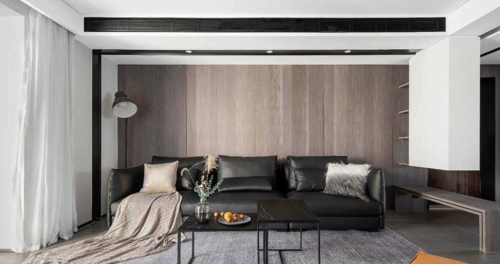 用相同的元素在整个空间中互相呼应,偏冷的黑色用大面积的木饰面中和,拥有质感的同时避免由暗色带来的冷冽。