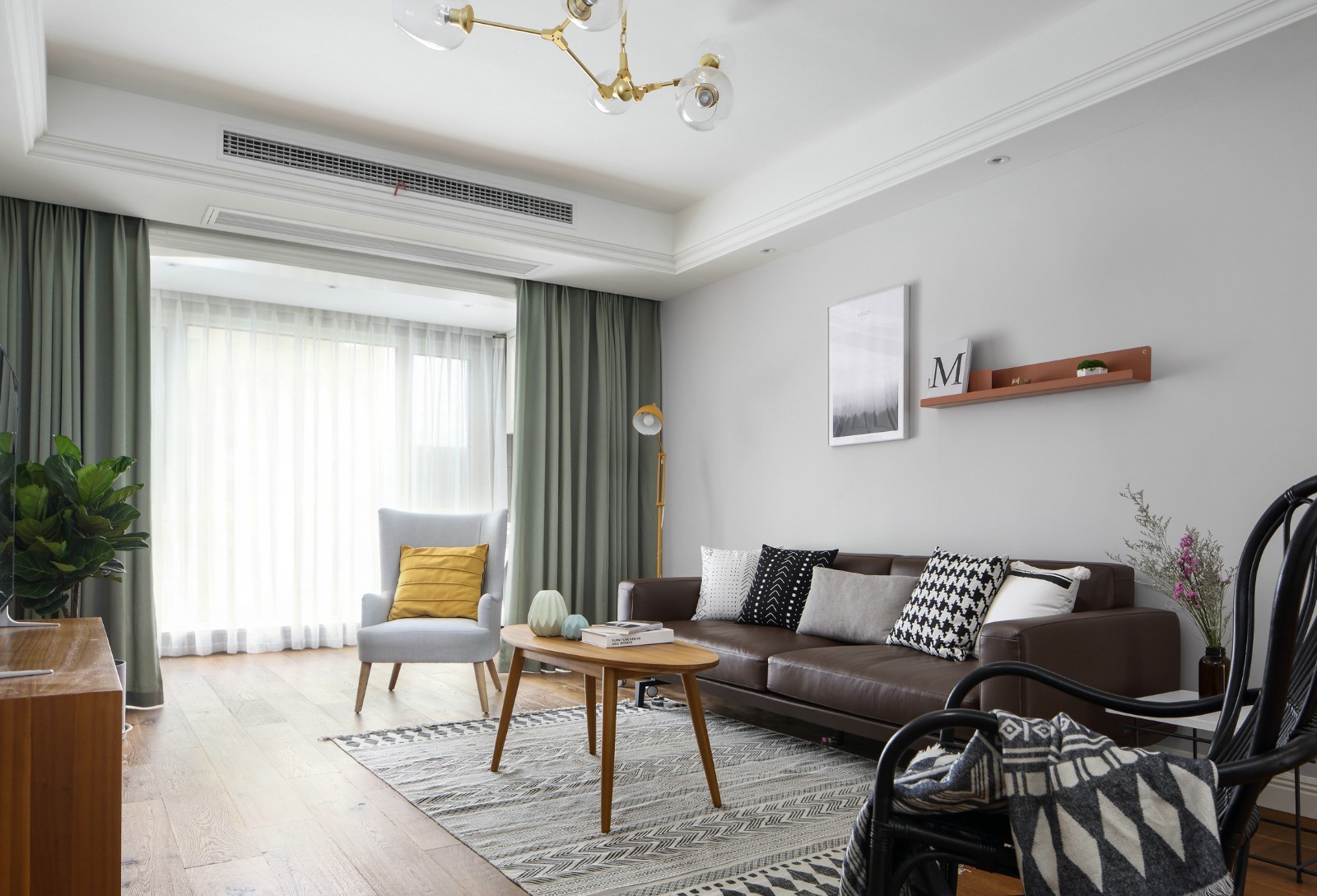 客厅以浅灰色为主调,几近透明的纱帘,深咖色的沙发,颜色各异的抱枕,简约的木色茶几,随意放置的搭毯,黄色的金属质感落地灯,整个空间看起来明亮又开阔。